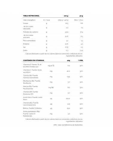 INGRÉDIENTS : Pâte de dattes* (Phoenix dactylifera), cacahuètes grillées (Arachis hypogea L.), huile de tournesol* (Helianthus annuus), complexe vitaminique**, amylopectine de riz, sel. *Issu de l'agriculture biologique.
