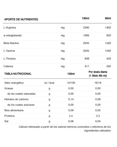 INGRÉDIENTS : Eau, L-arginine alpha-cétoglutarate, bêta-alanine, taurine, acidifiant (acide citrique), l-tyrosine, caféine, arôme, conservateurs (sorbate de potassium, benzoate de sodium), épaississant (gomme xanthane), édulcorants (sucralose, glucosides de stéviol provenant de stévia), colorant (caramel naturel). Contient de la caféine. Déconseillé aux enfants, aux femmes enceintes ou allaitantes (250 mg/60 ml).