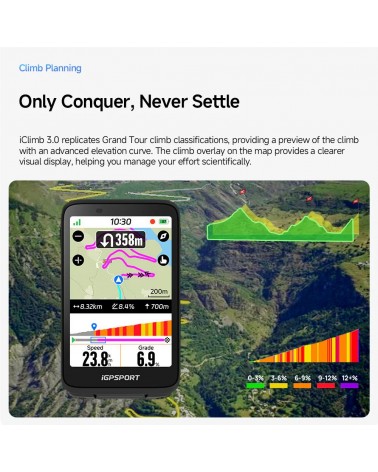 La fonction iClimb 3.0 reproduit les classifications d’ascension de type Grand Tour, avec une courbe d’altitude avancée et une superposition des montées sur la carte, vous aidant à gérer votre effort de manière plus scientifique.