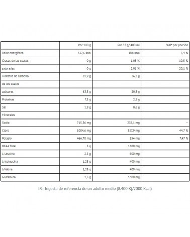 Comme il s'agit d'une formule très technique et avancée qui convient aussi bien aux débutants qu'aux plus expérimentés, nous y avons ajouté des acides aminés ramifiés (BCAA) et de la glutamine, car il a été démontré que la consommation de ces acides aminés avec des glucides pendant l'entraînement diminue les marqueurs de lésions musculaires (Valentine, R.J. et al., IJSNEM. 2008). De plus, les acides aminés ramifiés (BCAA), en particulier la leucine, sont fortement oxydés par les muscles, c'est-à-dire qu'ils sont utilisés comme source d'énergie, ce qui réduit l'utilisation du glycogène au profit des graisses. De plus, la consommation de ces acides aminés pendant l'exercice réduit le syndrome de fatigue chronique (SFC), c'est-à-dire qu'elle diminue la production cérébrale de sérotonine (neurotransmetteur lié aux symptômes de fatigue et à l'humeur) (Kerksick, C.M. et al., JISSN. 2.018). De plus, la consommation de glutamine a démontré une réduction des troubles gastro-intestinaux pendant l'exercice, grâce à une meilleure perméabilité intestinale.