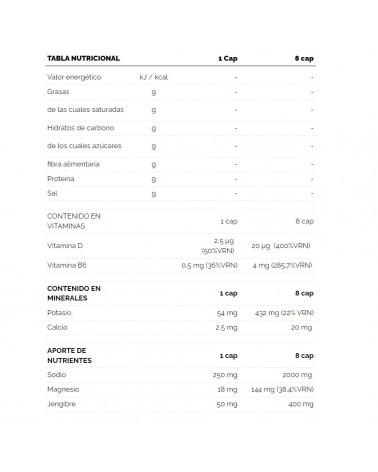INGRÉDIENTS : Chlorure de sodium, agent d'enrobage (hydroxypropylméthylcellulose), citrate de magnésium, chlorure de potassium, gingembre en poudre (Zingiber officinalis roscoe)(racine), gluconate de magnésium, citrate de potassium, anti-agglomérant (sels de magnésium d'acides gras), citrate de calcium, gluconate de calcium, anti-agglomérant (dioxyde de silicium), cholécalciférol (vitamine D) et chlorhydrate de pyridoxine (vitamine B6).