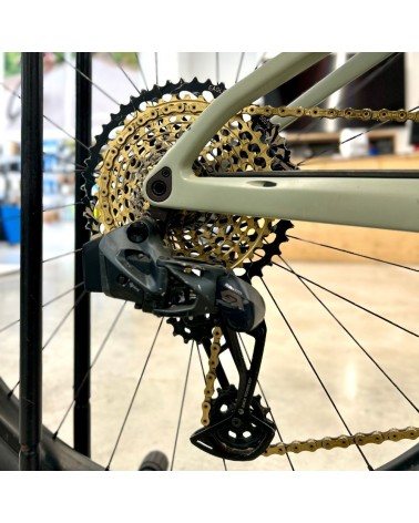 Sur cet exemplaire, en plus du montage d’origine haut de gamme, des améliorations remarquables ont été ajoutées comme les roues dt swiss 1501, un plateau ovale pour optimiser le pédalage et une chaîne dorée qui apporte une touche exclusive à l’ensemble.