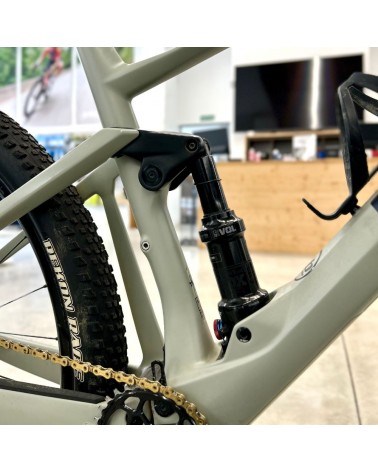 Vélo de montagne haute performance avec cadre carbone, suspension de 120 mm et montage orienté vers les riders qui recherchent un vélo rapide, léger et très efficace aussi bien en montée que dans les zones techniques. Cet exemplaire intègre en plus des améliorations comme des roues dt swiss 1501, un plateau ovale et une chaîne dorée, apportant un supplément de rendement et d’esthétique.